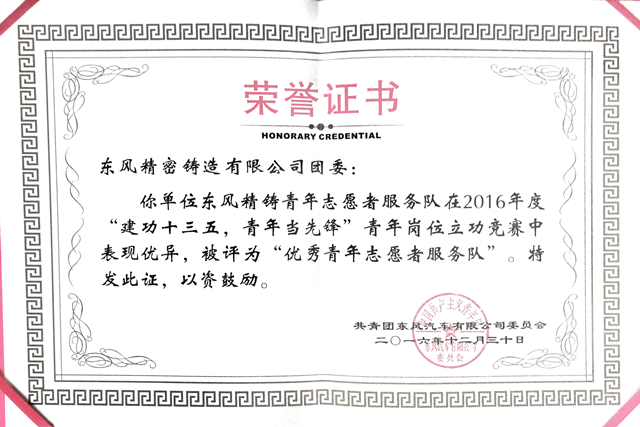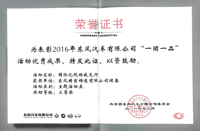 2016年度,東風精鑄團委積極開展“一團一品”創建活動,經年初立項、過程實施、成果總結、申報及上級單位評定等環節,東風精鑄團委“國際化現場我先行”主題活動榮獲東風汽車有限公司“一團一品”三等獎。并且在2016年度“建功十三五,青年當先鋒”青年崗位立功競賽活動中,東風精鑄團委帶領團員青年立足崗位、積極作為、勇于擔當,被評為“東風汽車有限公司優秀青年志愿者服務隊”及 “東風汽車公司優秀青年志愿者服務隊”。